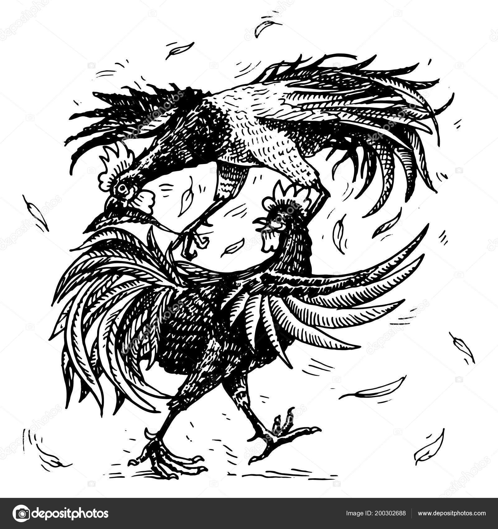 Cockfight Or Gamecocks Bird Sport On The Farm Hand Drawn